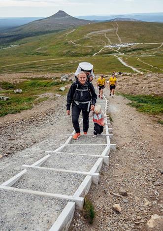 Beskrivning: Ta dig upp på Idre Fjälls topp och njut av utsikten 892 meter över havet. Via Fäboden och Skills Area tar du dig vidare via toppleden. Observera att denna led delas av både vandrare och cyklister på väg uppför. Visa hänsyn! Längs vägen ser du stora högar täckta av presseningar eller bark. Det är vår banbrytande metod för att spara snö till riktigt tidig premiär för alpint och längdskidor. Väl på toppen kan du njuta av de milsvida vyerna och pusta ut på Restaurang Utsikten.